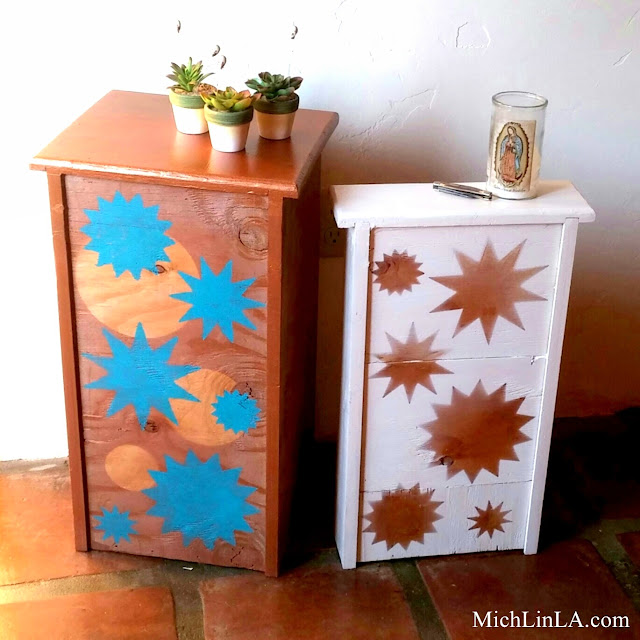 My favorite thing about them is the reverse-stencil effect, which shows some of the natural wood. The circles on the large drawer, and the stars on the skinny drawer, were created in the same way.