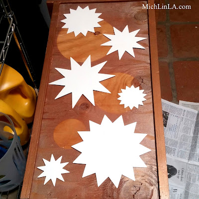 For the two-tone blue table, there's one more step. I popped the stars out of a bunch more stencils, and laid them out on the surface to decide on placement.