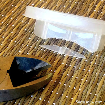 To adapt the shield for jewelry, you need one quick trick that allows it to lie flat when worn. It's this: use wire snippers to trim off a bit of the curve in back. Like so: