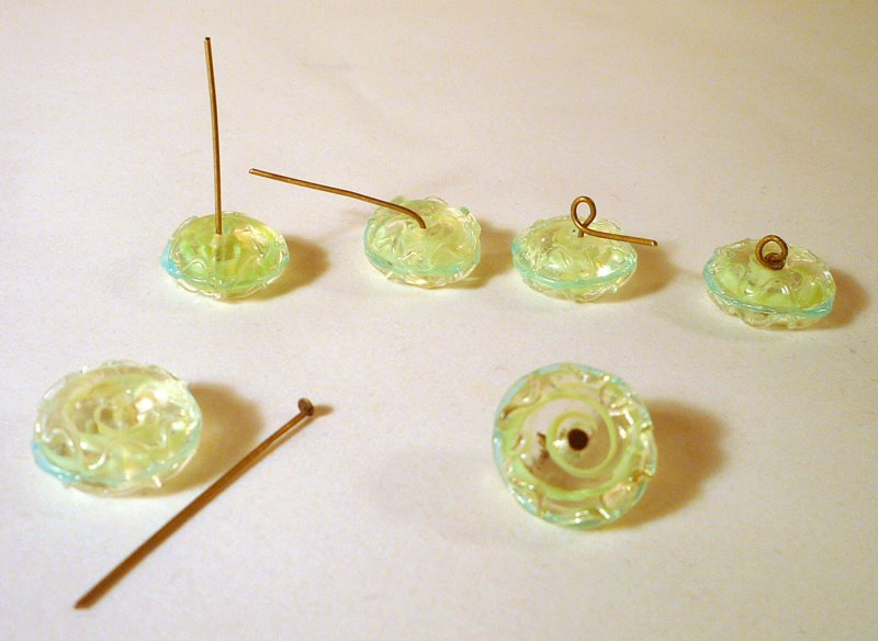 It's done using a basic wire-wrapping technique called a wrapped loop. You put a bead on a wire headpin, and if you wrap the wire at least one full turn after making a loop, the loop is sealed closed and it becomes the shank. You would sew it on the same way as any button.