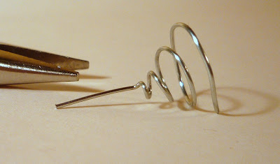 Start with some short lengths of wire. Flexible enough to bend into a swirl, but not too flimsy - it has to be able to keep its shape. I used some ornament hangers, 100 for a buck at the $ store. Leaving a little extra length at the top, wrap your wire around something taper-y. A pen...