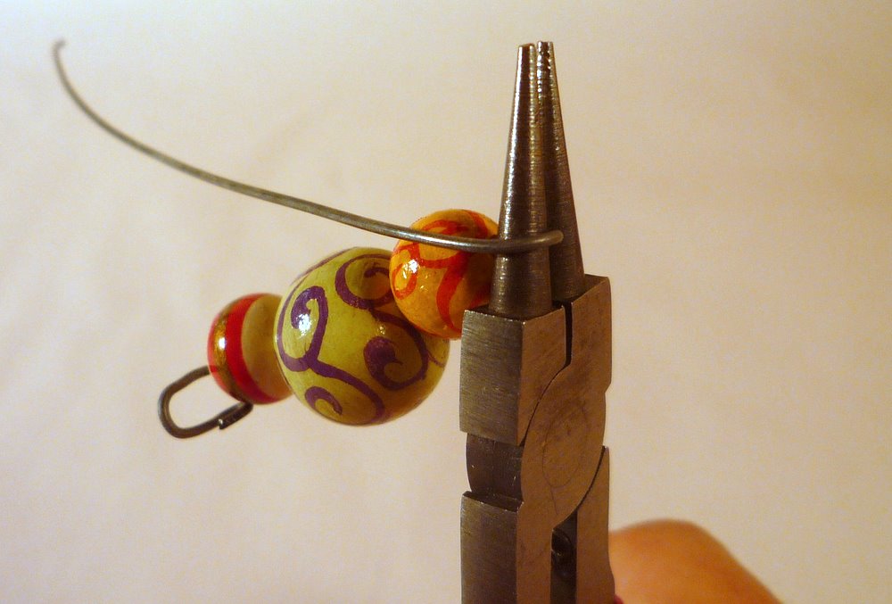 Almost done! Here comes the spring-loading step, that makes the pin work! Right next to the beads, grab the long tail in your pliers. Start turning a circle...