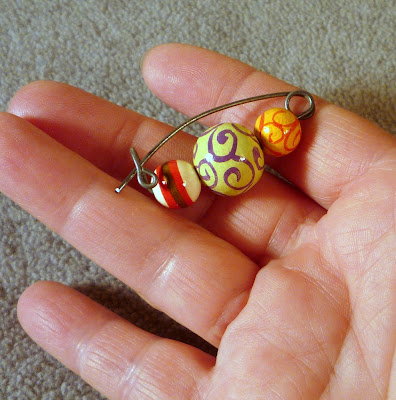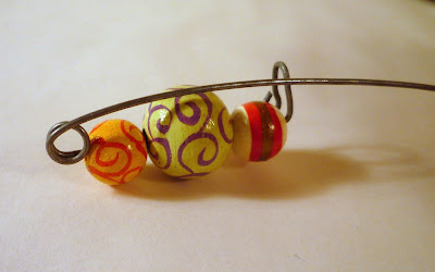 It's a good idea to file the sharp end a little smoother - try an emery board or a metal nail file. (Note: if you have skills, you can file the end to a point. I never bother, because I only wear these in loose-weave scarves or knit sweaters.)