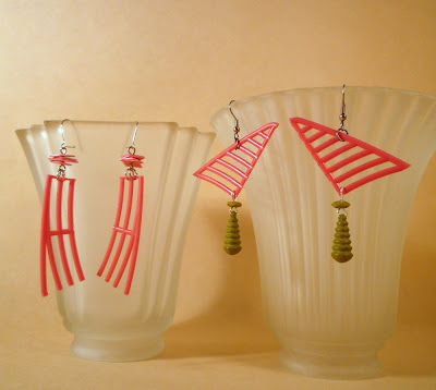 I like how these jewels evolved in my head. I started out with simple shapes, embellished with bead dangles, as in the green drop earrings below.