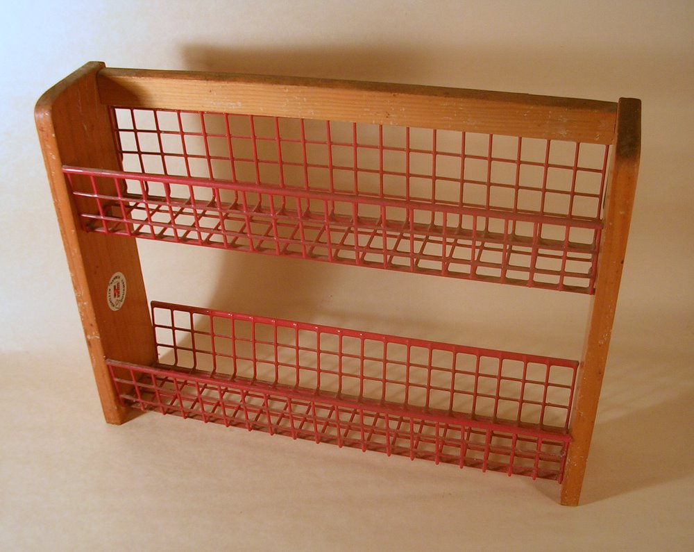 Spice racks on the brain, I scurried out and bought two of these (with matching spice jars) at my neighborhood thrift shop.