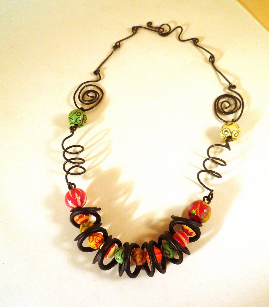I took some heavy black wire (actually rebar tie wire from the hardware store), and a handful of hand-painted beads I bought in Spain.
