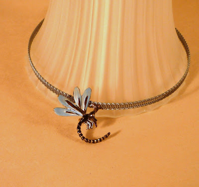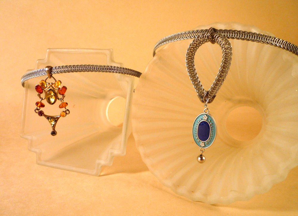 It's convertible, too; just slip different pendants on and off the basic choker. Notice the blue pendant is made with a 3-inch strip of boning, flattened sideways.
