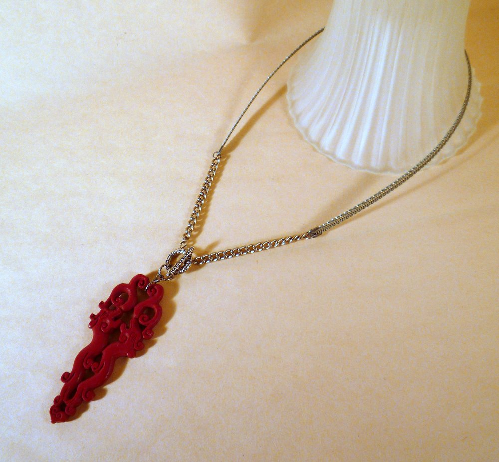 All I did was add a bit of chain to each end, then a toggle clasp with a big pendant attached: