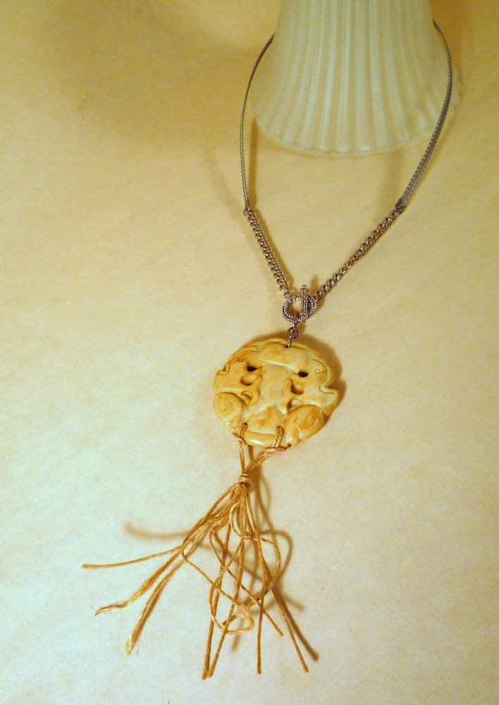 Using the same clasp idea as the one above (a pendant hanging from a toggle), and an 8 inch strip of boning, here is what you get: