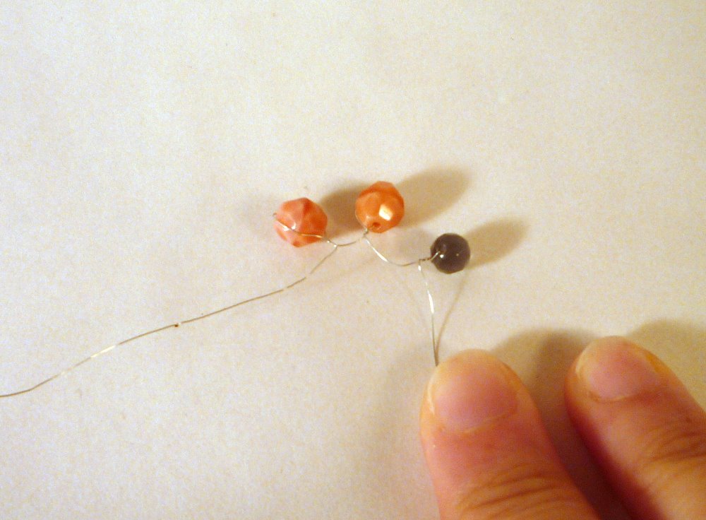 Choose a bunch-o-beads. How many? I couldn't tell you. A bunch! Thread one onto the wire. Near one end, fold the wire down against the bead, like this: