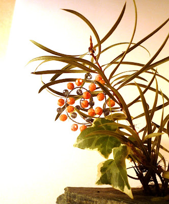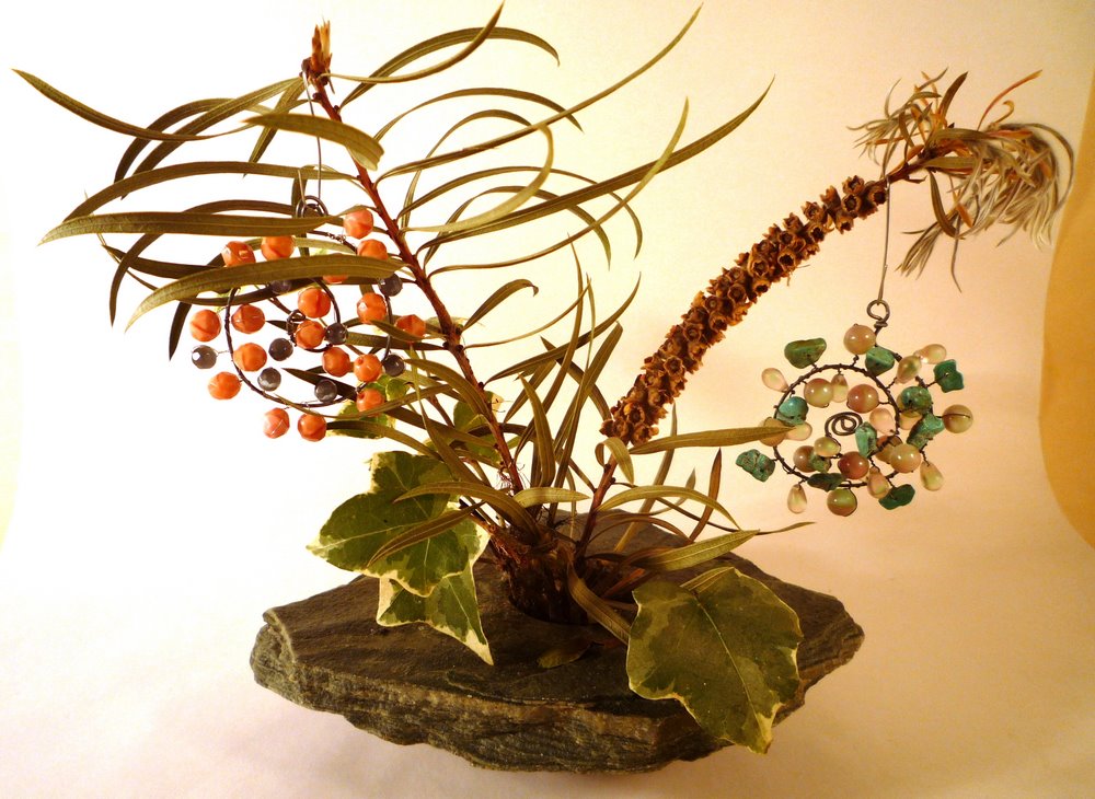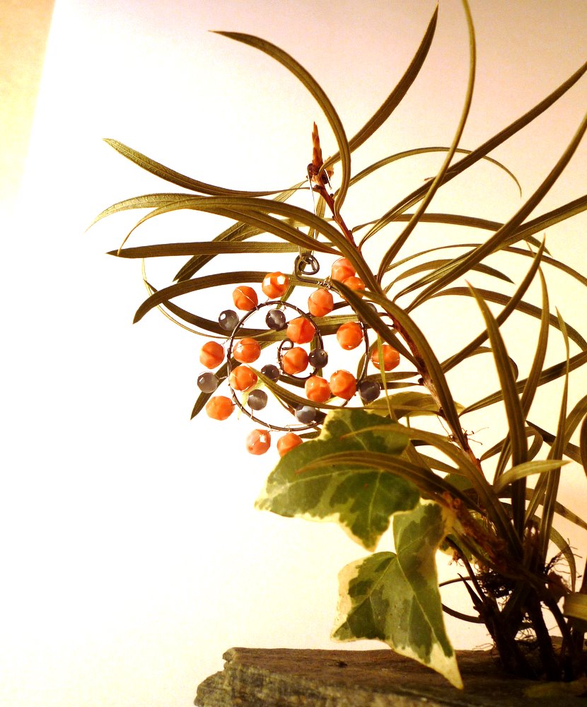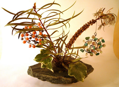 Re-shape your wire again, into a reasonably regular spiral. Now just start arranging the beads, sort of as you would a bouquet of flowers. There's no way to show a picture of this - but you will twist and turn, fluff and floof until you like where each bead is sitting...