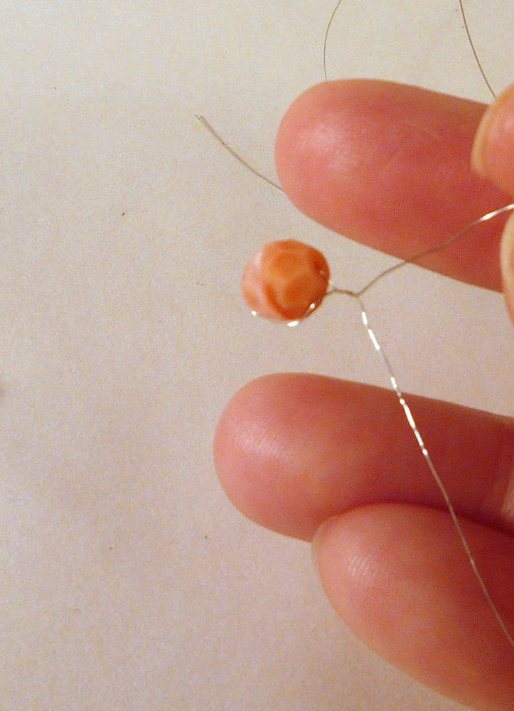 Be sure to leave a wire tail a few inches long, you'll need it later. Now spin the bead a few times, twisting the wire together: