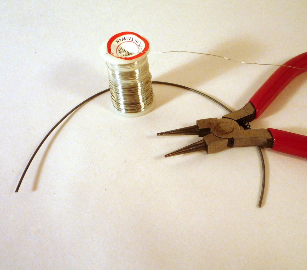 You'll need some heavy craft wire and some skinny craft wire. (The gauges aren't really precise; the heavy wire should be stiff enough to hold your beads without sagging; the skinny wire should be thin enough to twist with your fingers.)