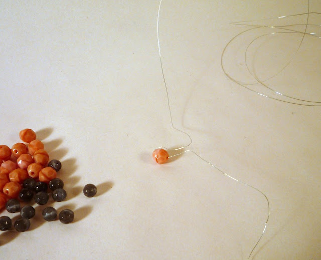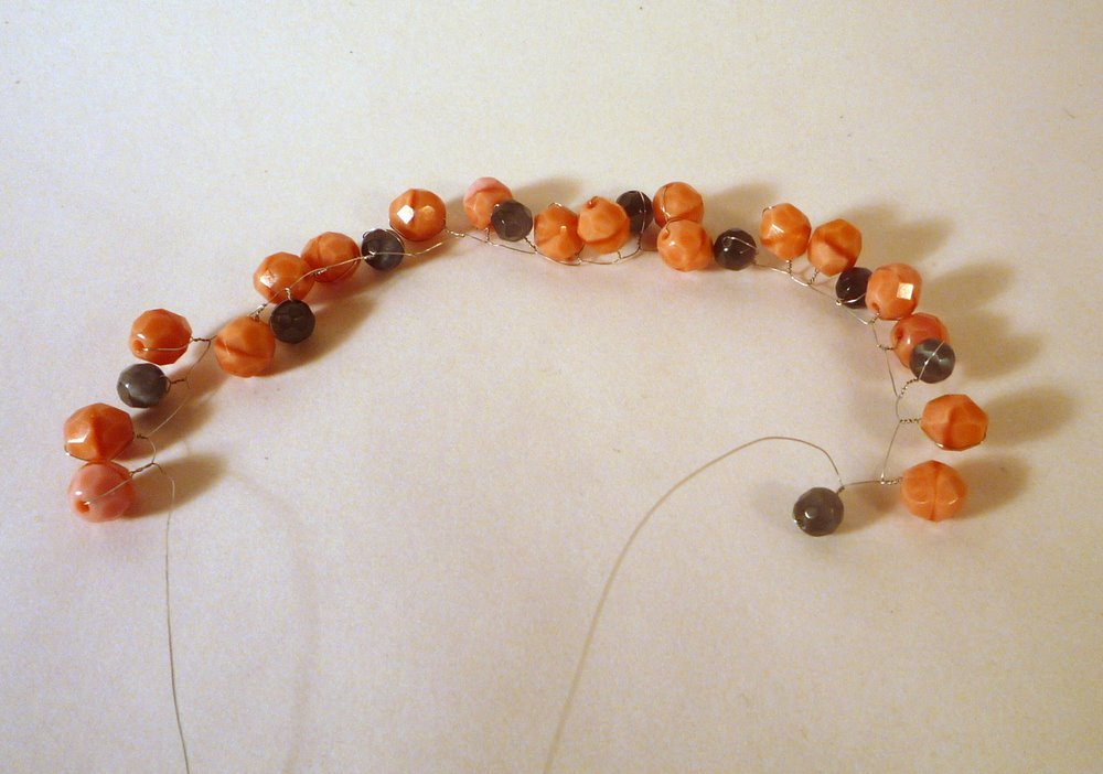 Fill up your skinny wire with twisted beads, until you have a long twine-y, vine-y thing. (This is a mindless, relaxing process; I do it while watching TV.) It will look like this: