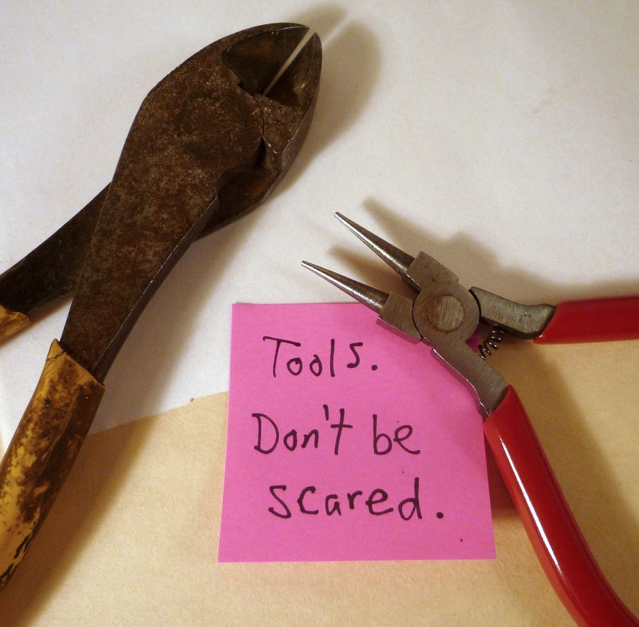 I like the fact they are small and feminine, but with a spicy punk edge. Tutorial, anyone? This one is not for the faint of heart, but it is super fun. You will need round-nose pliers and a strong wire cutter.