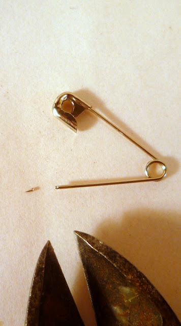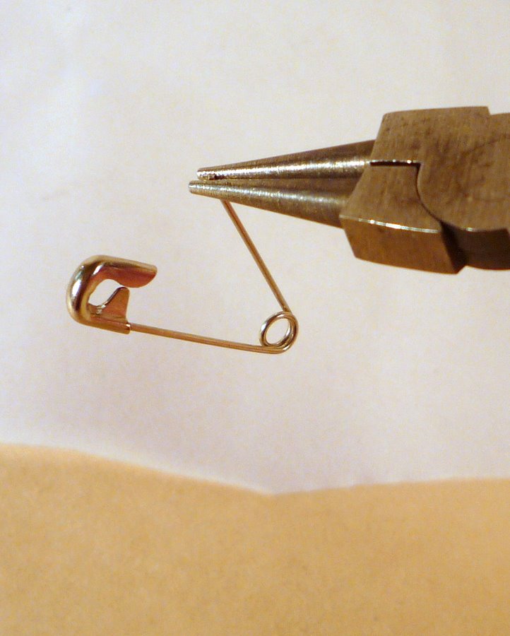 See? All you are doing is removing the point. Before you do it, though, listen up, this is important. This de-pointing of safety pins is kind of gnarly. So wear safety glasses. I mean it.