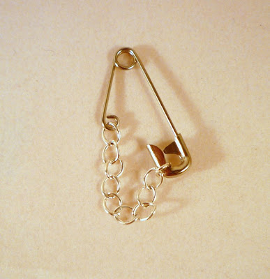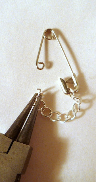 Attach a little piece of chain between the teeny loop and the rounded end of the safety pin. You can use jump rings, or just open and close the end links of the chain, as I did here: