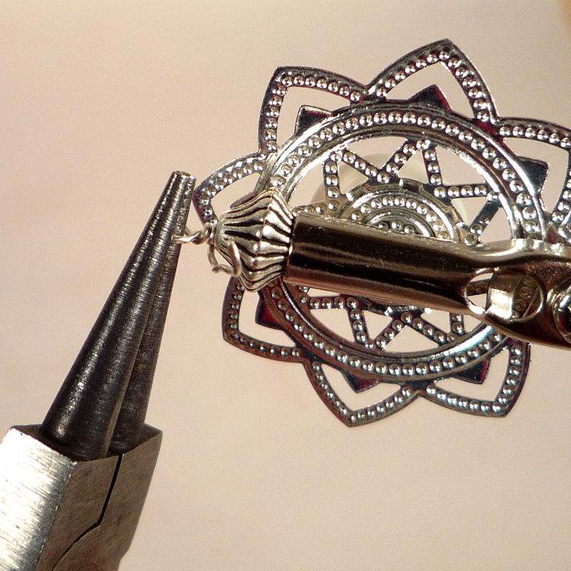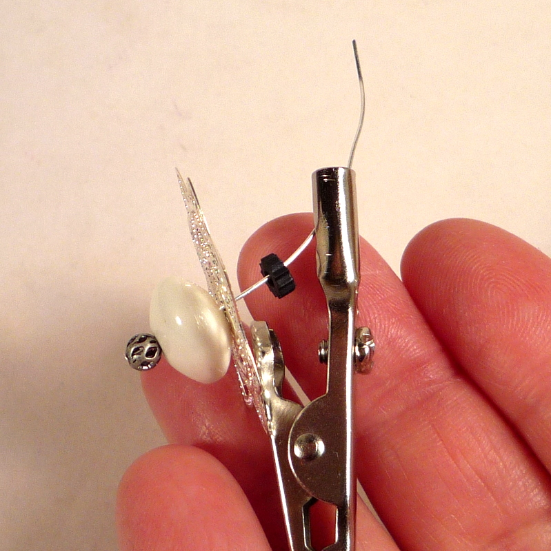 Here are the steps: 1. Put all the beads and the cushioning thingy on the headpin. 2. Thread the headpin up through the hole in the alligator. 3. Add a final bead, one that will fit tight into the top of the alligator.