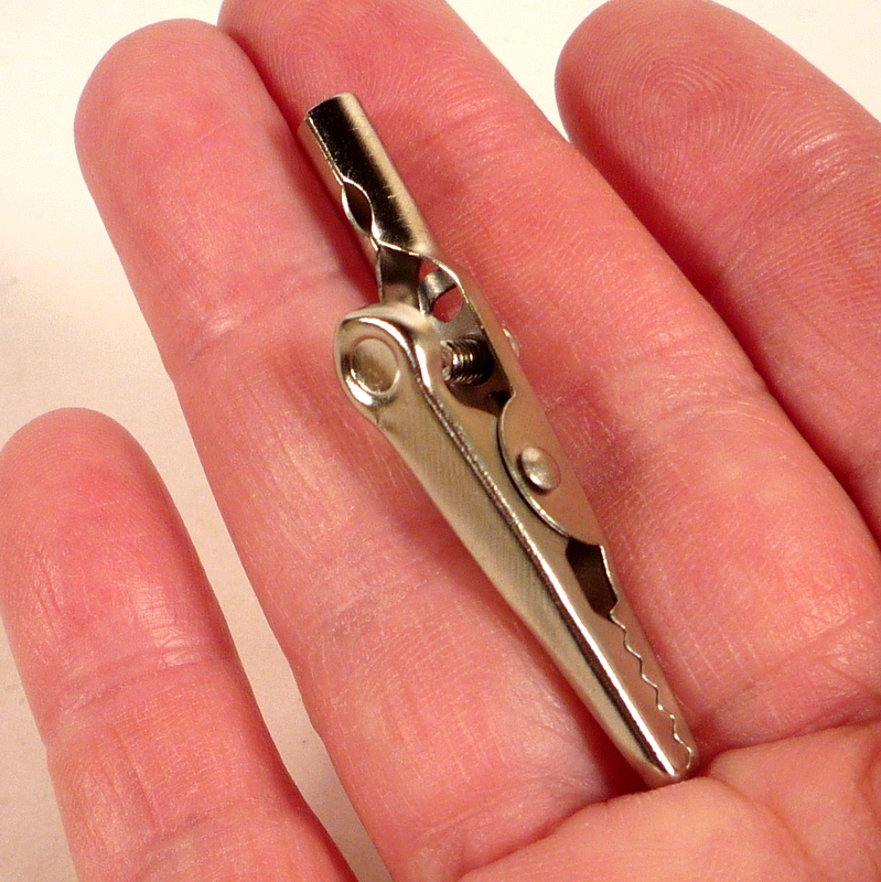 I started with this alligator clip, which has a hole in the middle of the cylinder-shaped body:
