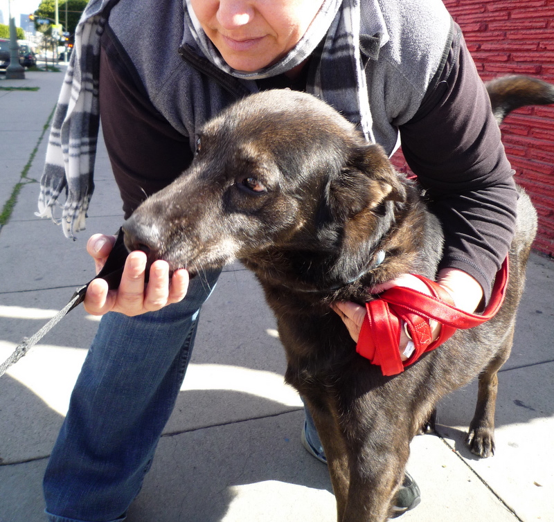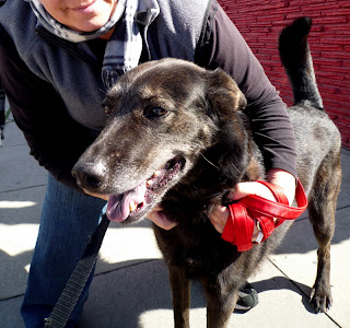 Bella is large and tall and soft and kind, and she looks like a black wolf. There's something uncannily sweet about her - she cuddles up to everyone she meets, her tail sweeping back and forth in gentle happiness. She gives her paw to shake. She sits like a perfect lady, and has excellent manners on a leash. She is wonderful!