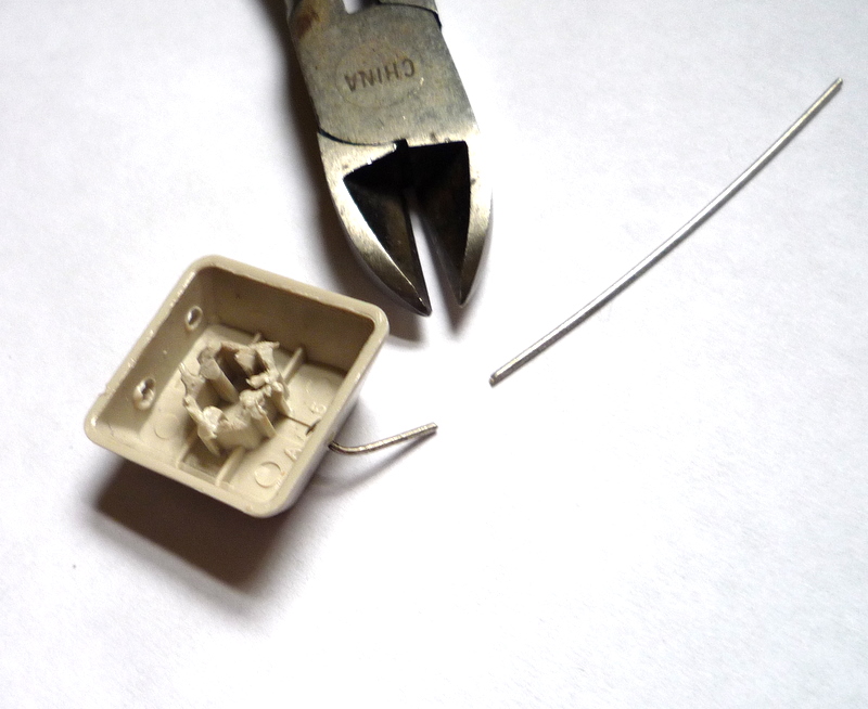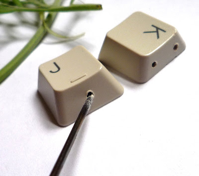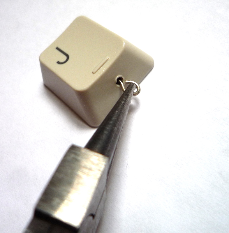 I used the same method of melting holes, and simply strung craft wire through each computer key, with little beads in between.