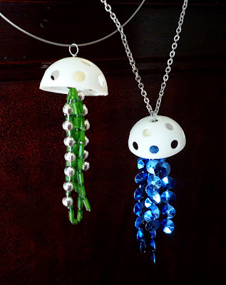 Last time, I showed you how to make fancy beaded tassels from leftover Mardi Gras beads. Let's turn some of those tassels into jellyfish, shall we?