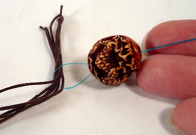 Cut a couple of short pieces of string and tie a knot around them using the two original string ends. It's a little hard to see in the picture, but when you pull the knot tight it disappears inside the big bead: