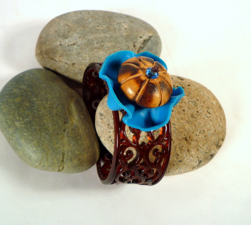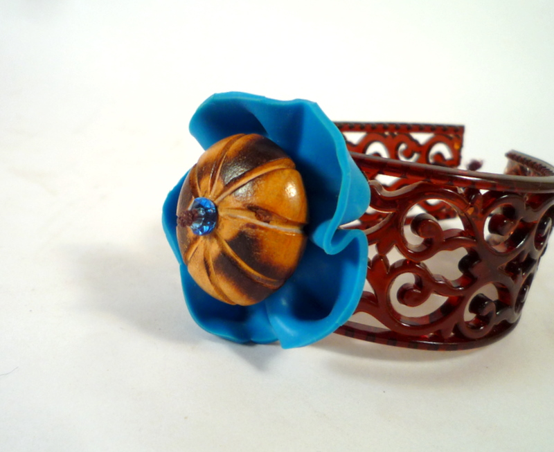 Huh. Jeesh. What the heck? You might recognize the filigree cuff part from a long-ago post using dollar store headbands. (Click here for the tutorial.) But what, oh what, is that rumply blue thing?