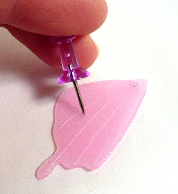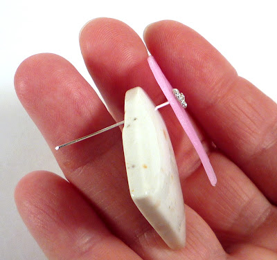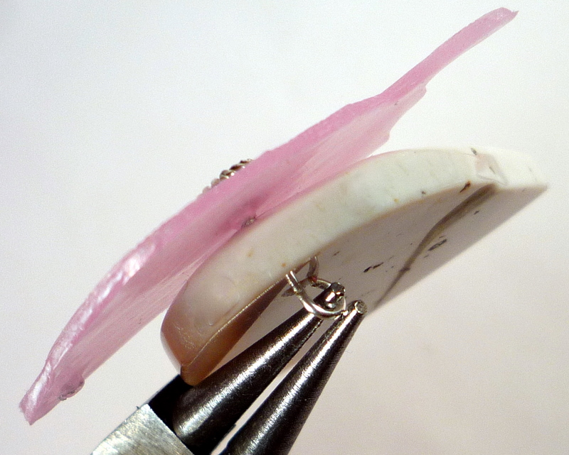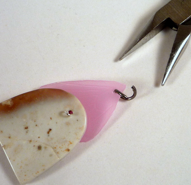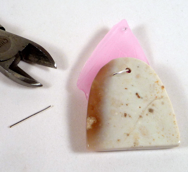 Once you have two holes, stack everything on the headpin, using the found object's center hole. Then fold the headpin flat against the back of the pendant and trim it short.