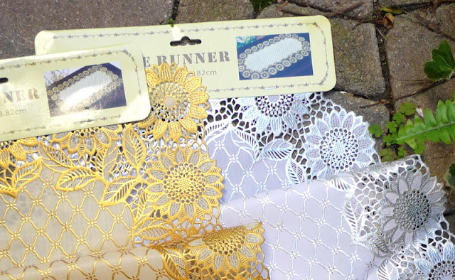 World's Ugliest Plastic Lace Table Runners. Soooo hideous. Overdone, ooky, metallic and god-awful. I got them at my neighborhood dollar store - but had serious doubts about whether they were worth that much.