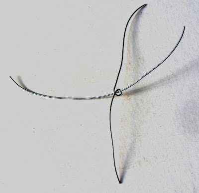 Start with two 6" pieces of hefty craft wire (I used 18 gauge). Make a loop in the center of one wire. Then thread the other wire through the loop. Like so: