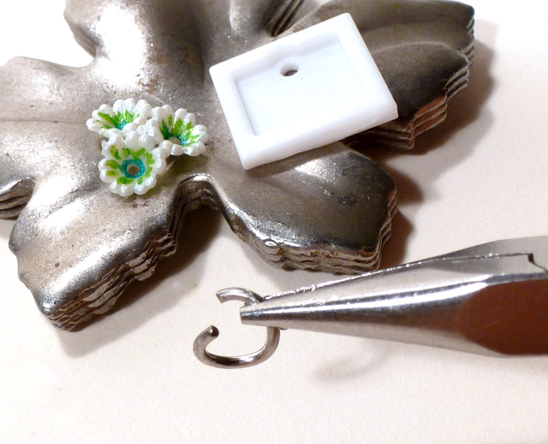 Step three: open a jump ring, add a charm and a mini frame, and twist the jump ring closed. If the jump ring is light, you can use your fingers and one pair of pliers; for a heavier gauge, you'll need two pairs. (Sorry, no picture of that 2 plier move.)