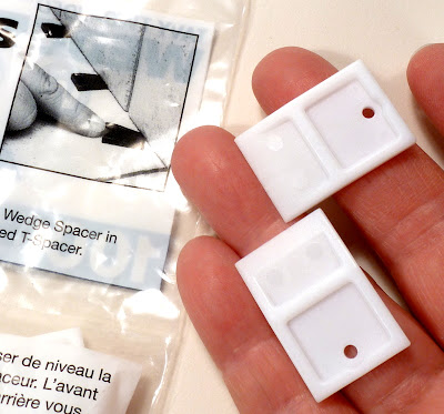 They are wedge spacers for setting tiles. 100 of them cost less than four bucks! I found these at Lowe's, but they are available other places, too. (Click here for the manufacturer's website, there's a list of retail sources on there somewhere.)