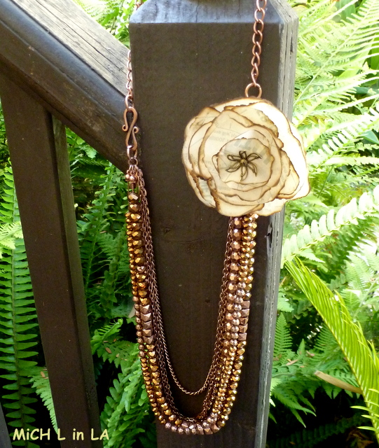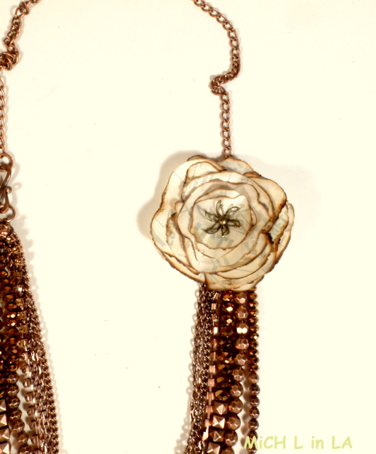 Arrrrrgggggghhhhh!!!!!! Mkay. First. GORGEOUS necklace...Spectacular! Now for the amazing petals? I keep going back and forth thinking it can't be paper but that's what I keep coming back to. It looks like some sort of vintage ad or handbill. I. Got. Nuthin.