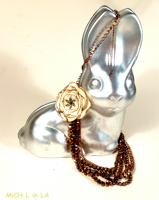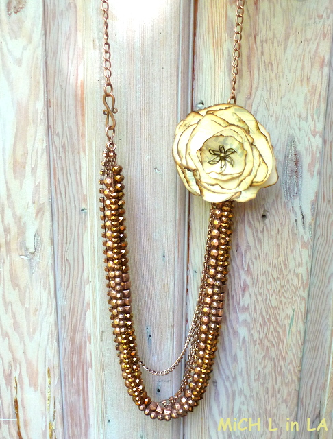I designed the flower to be both a pendant and a brooch. You can pin it, or hang it on a necklace as shown here. (BTW, the cool coppery necklace is a sneak peek of sorts - it's from Styled by Tori Spelling, a new line of jewelry-making components I've been trying out. Gorgeous, eh?)