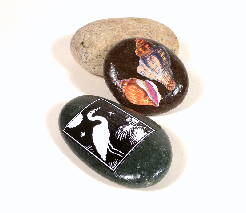 What are they for? Not sure yet! But I have a big, big box stuffed full of random tiny bits of paper art. Clipped and saved over years and years, with the idea of turning them into pendants some day. It was so simple to Mod Podge a few of them onto these river rocks.