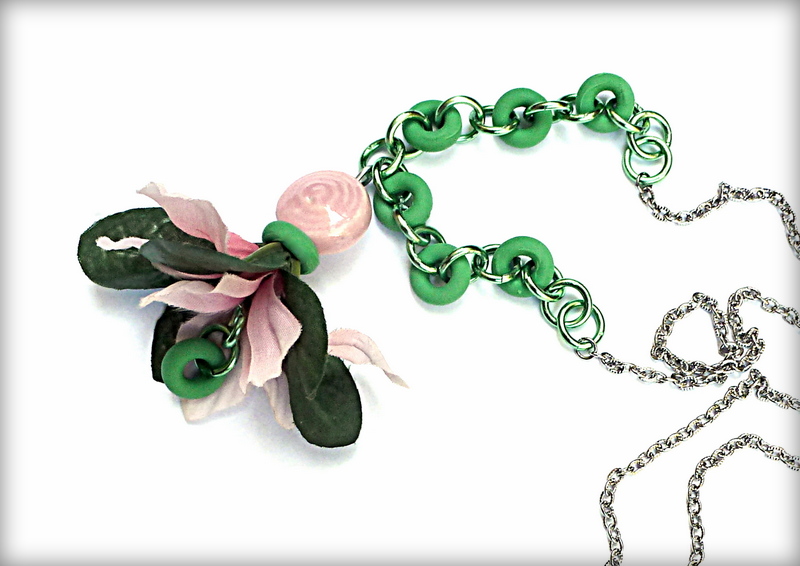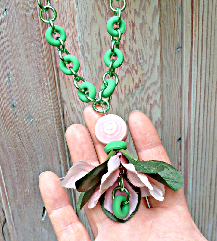 Your challenge: identify the mysterious secret ingredient in this upcycled jewelry project. What are those bright, bold kelly green circles?