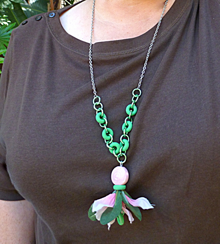 Hellooo, my friends! It is time! Shall we play a new round of Guess The Mystery Thing? (It's my crafty guessing game giveaway, and everyone is invited.) Take a good look at my newly invented, offbeat flower necklace...