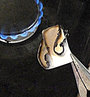 Once again, another wonderful upcycle..I love the rocking leathery look of the shelf liner against the dainty singed flowers from the backing. I forgot I could use my gas range in lieu of a lighter or propane torch for my jewelry projects..uh oh...