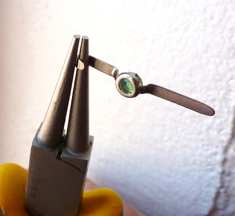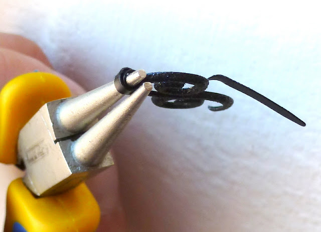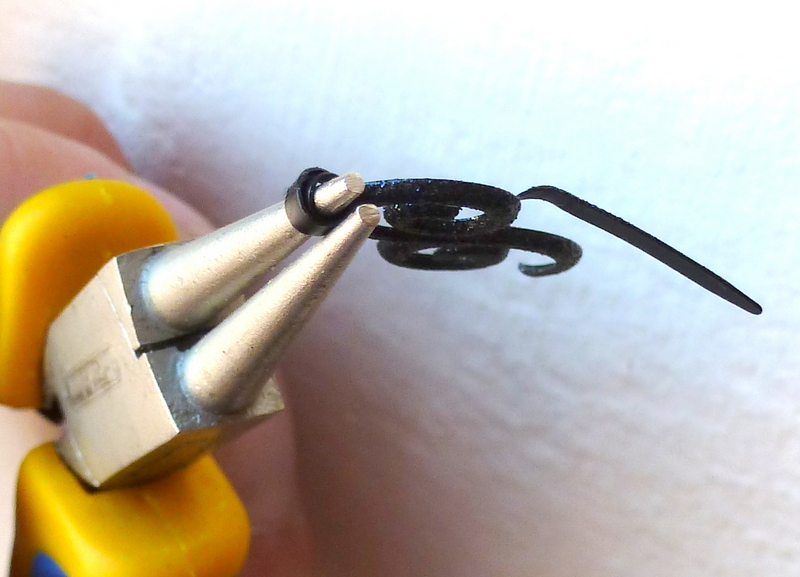 Grab the end of one arm with round-nose pliers and start rolling it towards the center, like so: