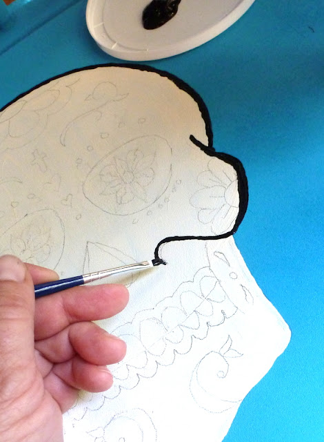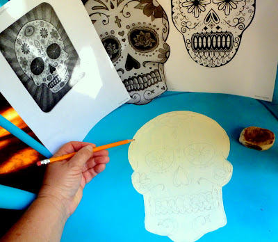 I googled some references for calavera skulls. Straining my drawing "skills" to breaking point, I did a pencil sketch, then laid down the black-and-white basics.