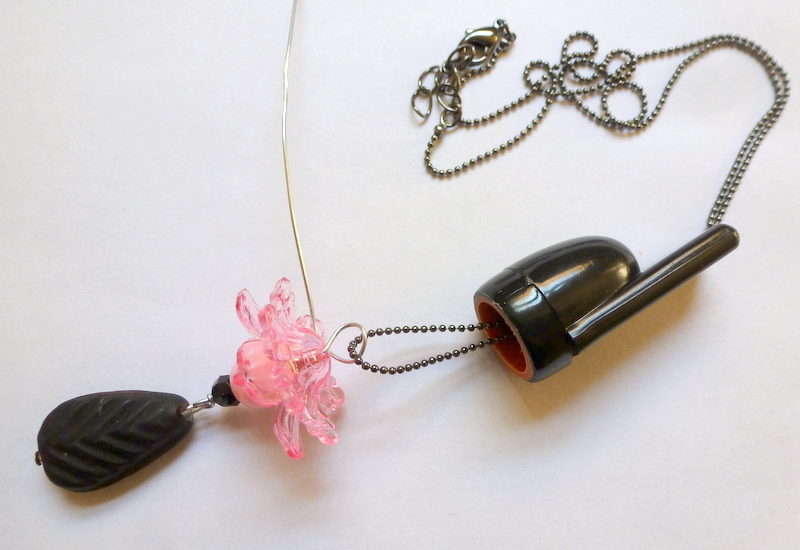 Finagle a thin cord or very skinny necklace chain down through the tiny whistle opening, all the way through and out the bottom of the mouthpiece.