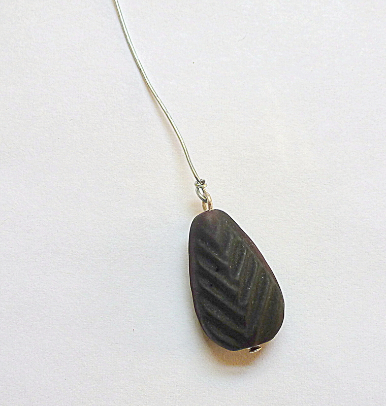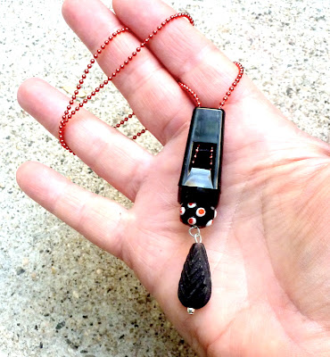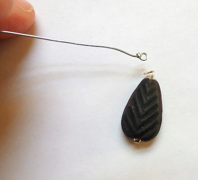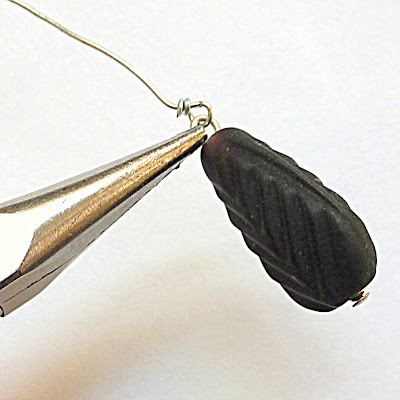 Next add a stack of interesting beads (or one big bead, as in the green & black and red & black necklaces pictured above). Then fold the wire down tight against the top of the beads.