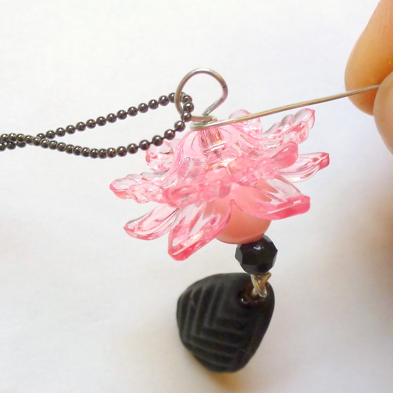 Slip the middle section of your chain into the unfinished wire loop, like so: