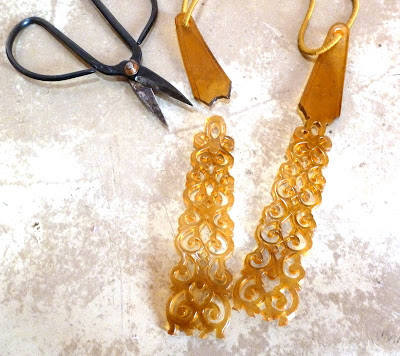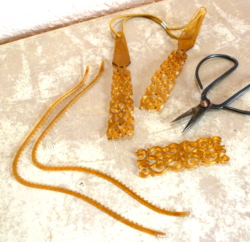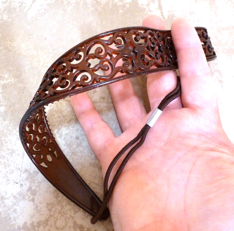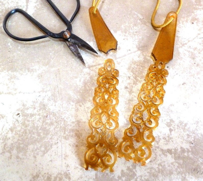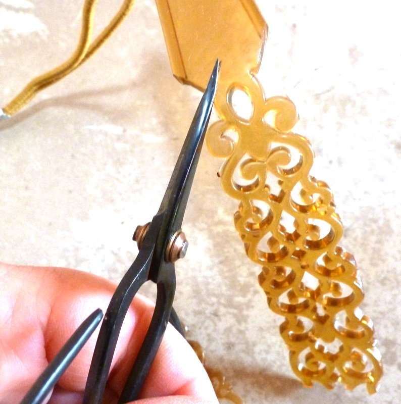 Trim the edges from the headband. Then cut straight across on either side of the center - pick a spot where you think the filigree will be the right length for your shoulder-dusters. Like so: