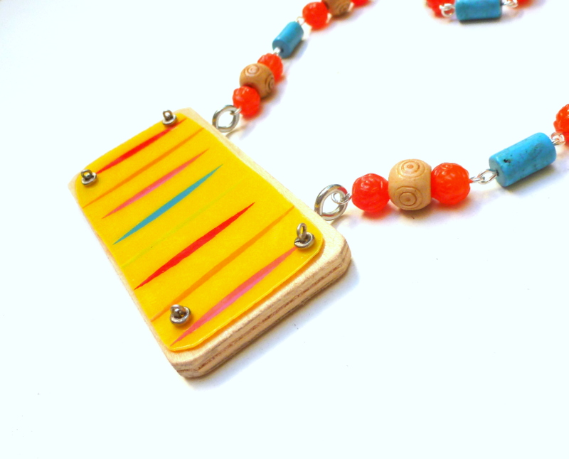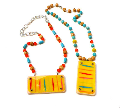 I love these necklaces, they're so bright and fun! I'm going to guess that the yellow overlay pieces are from old yellow sunglasses, with stripes painted on?