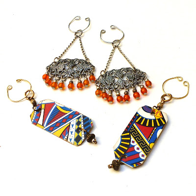 Fray D. Cat: You've upcycled so many things and you don't have your ears pierced?? Shocked, I am. These are beautiful dangles, and the ear cuffs look great. Would it get in the way of those darn earbuds, though? I like your sentence, "anything with a jump ring can become an earring"..I always say "anything with a hole in it can become a pendant." Also in your case, "anything at the dollar store can become jewelry."