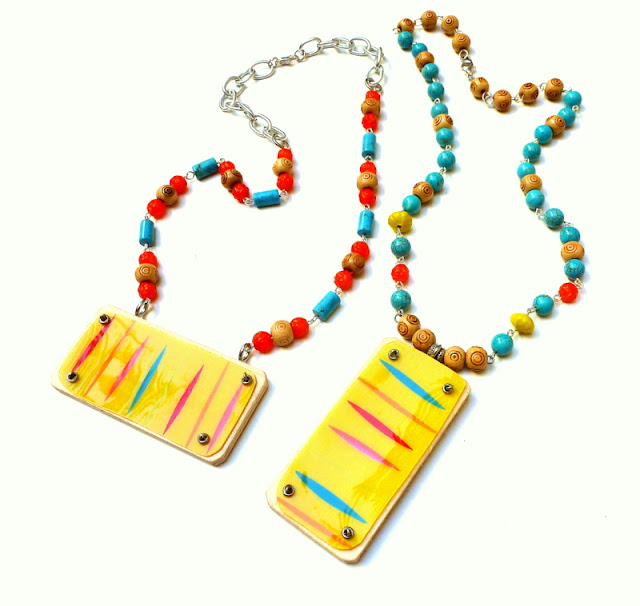 To make the pendants, I cut out rectangles from the stripey bits, and cold-connected them to wooden dominoes.