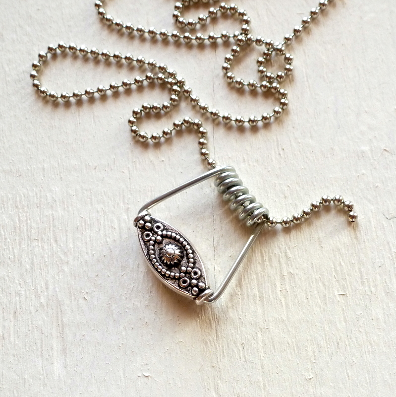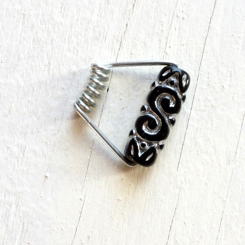 Stretch apart the wire ends, slip on a large-hole bead, and let the wires snap back into place. That, my friends, is ALL there is to it. Watch: