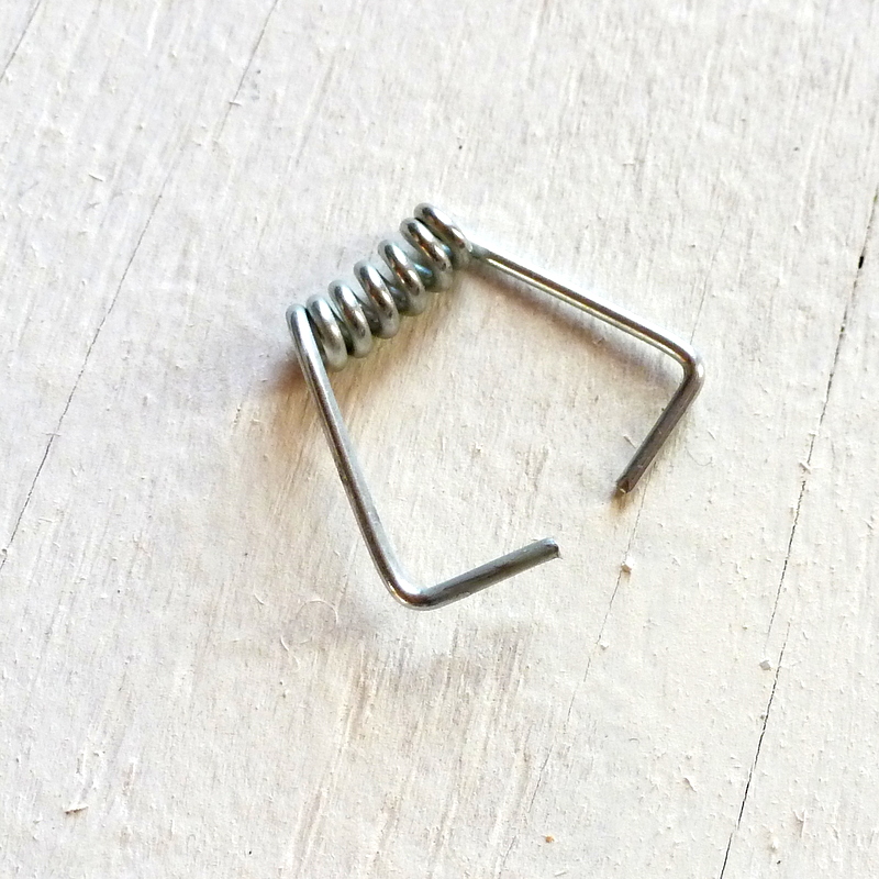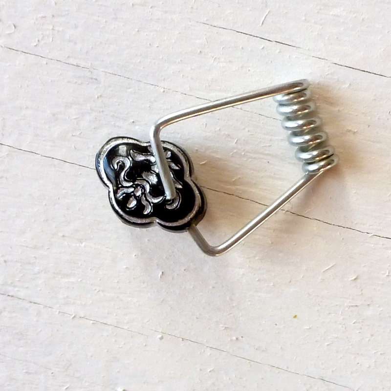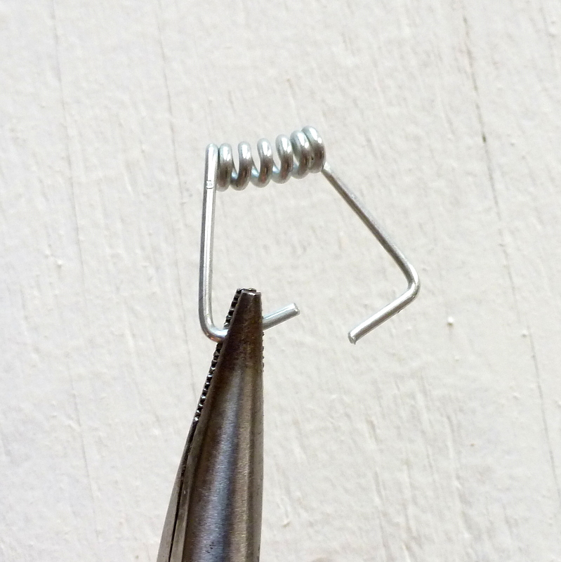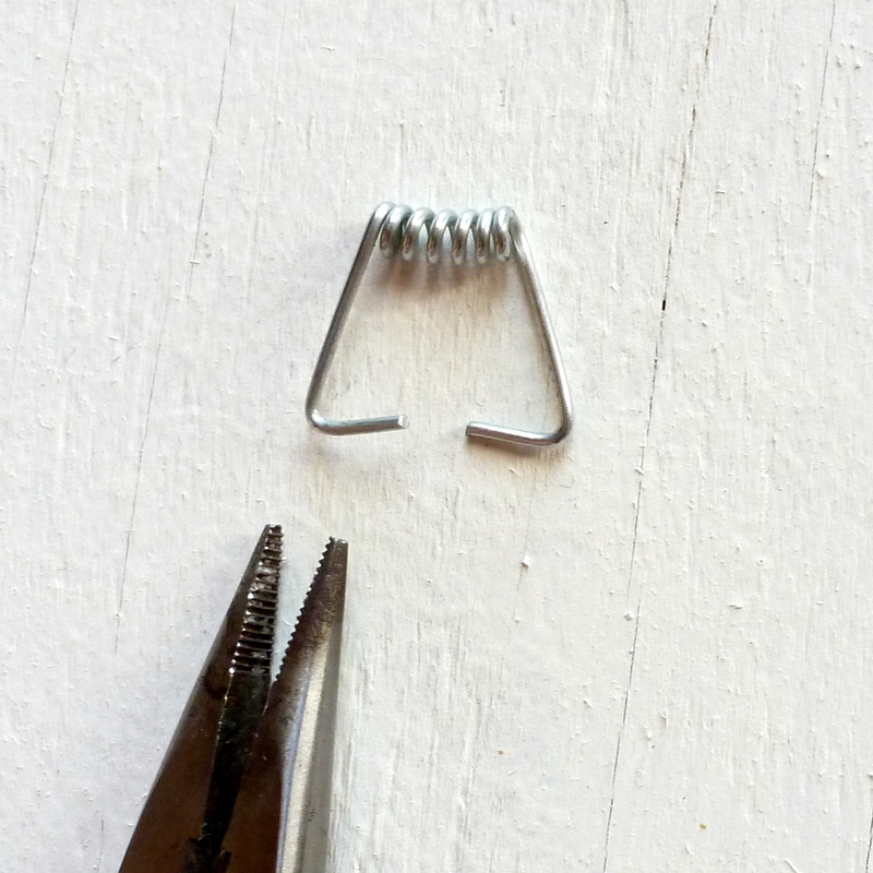 Hi, Amanda! I made the wire pieces. Hmmm, I will try to describe the making without pictures. Use a one and a half inch piece of craft wire; make a tiny loop in the center. About 1/2 inch away from the loop on both ends, bend the wire inwards so the ends overlap. It should look like tiny circle on top of a larger triangle. Spread apart the overlapped ends and slip them inside the clothespin coil, then squeeze them back together.